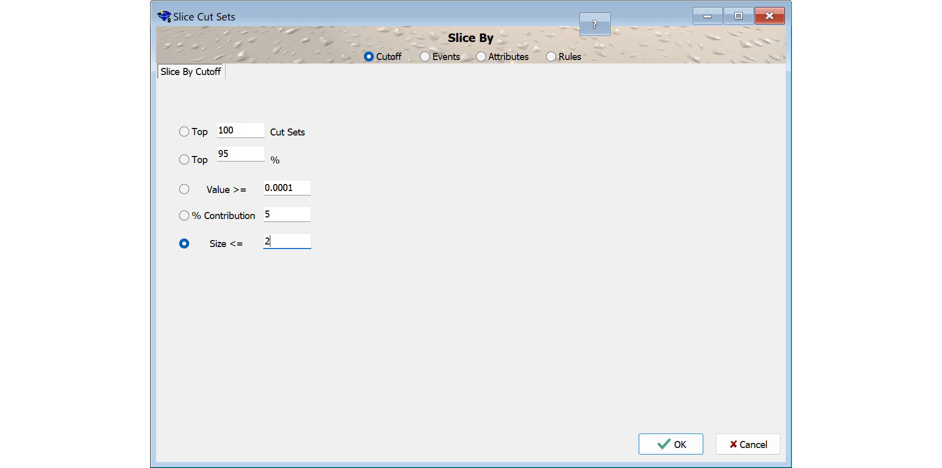3項以上の積項をカットします。その理由は3つ以上のフォールトが重なる確率は非常に低いため、規格上は安全フォールトとなっているためです。カットするには図905.1のように、Size <= 2と入力します。