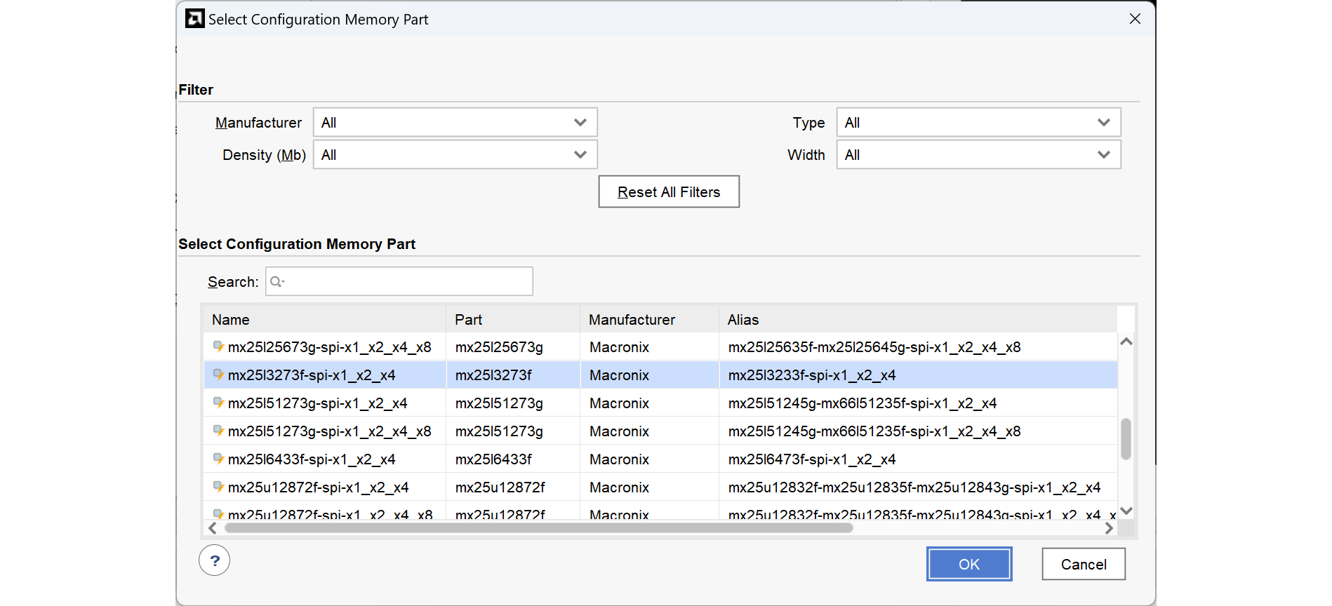 • Binファイルの焼きこみ: 選択するFlashの型格に注意します。以下の図のとおり、mx25I3273f-spi-x1_x2_x4を選択します。間違えて異なる型格を指定すると、Vivadoがエラーを出力し正しい型各を教えてくれます。