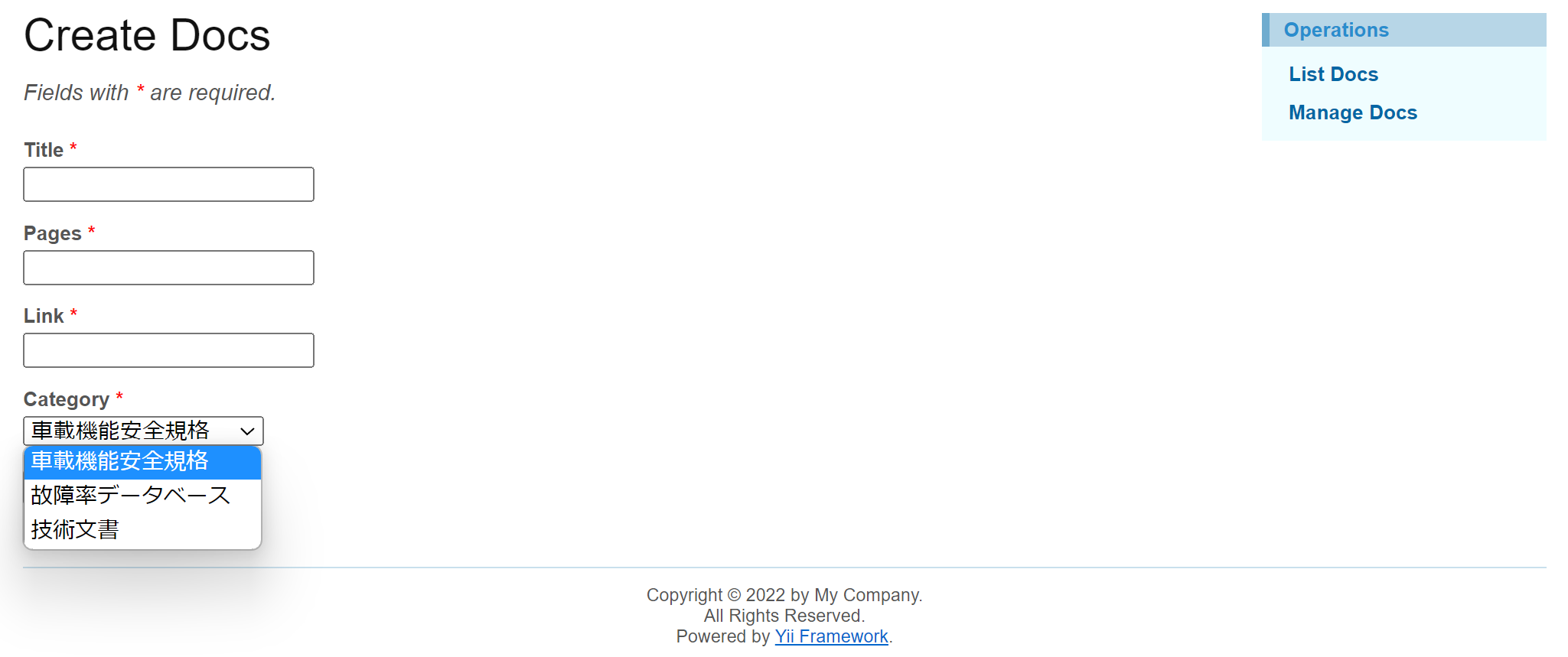 index.php/?r=docsとしてドキュメント一覧表を表示します。表549.1に示すように、index.phpにより実行されます。