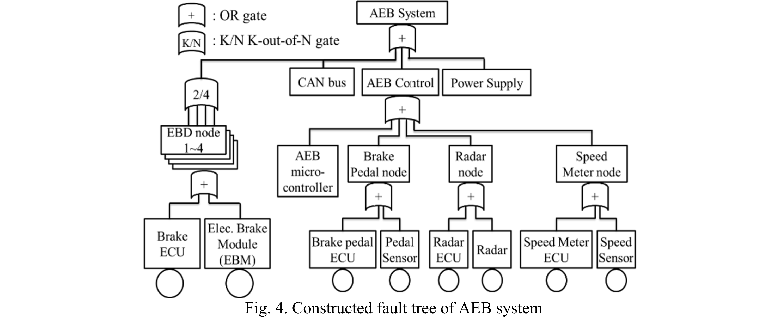 この論文ではAEB(autonomous emergency braking system)を題材としています。以下にAEBシステムのFT(Fault Tree)を示します。